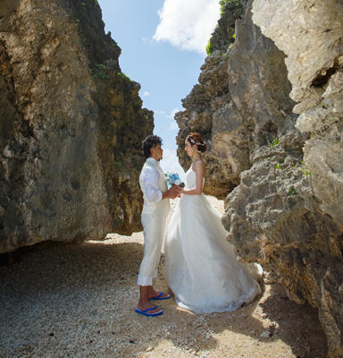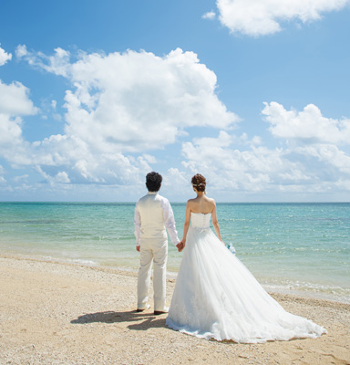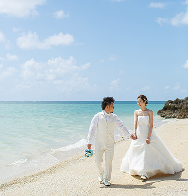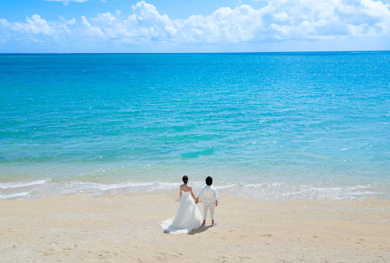 沖縄でのフォトウエディングならダントツでビーチ撮影が人気。フェア限定プランなら百名ビーチや北名城ビーチでのドローン撮影も無料で行えるから”沖縄らしい”ダイナミックで美しい写真を残すことができます。